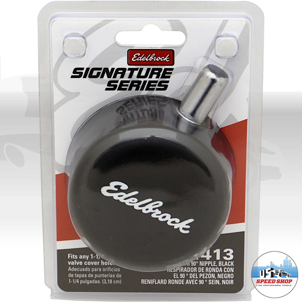 Edelbrock's schwarze Entlüfter aus der "Signature Series" sind hochwertig Pulverbeschichtet mit weißem "Edelbrock" Schriftzug. Der 25,4mm (1") Flansch verfügt über ein integriertes Schwallblech gegen ungewollten Ölaustritt und ist geeignet für Ventildeckel mit 31,8mm (1.25") Bohrung. Weiter verfügt diese Entlüfter für das Kurbelgehäuse über einen 12,7mm (1/2") Schlauchanschluss durch den entstehende Öldämpfe über ein PCV-Ventil in den Luftfilter oder einen Auffangbehälter geleitet werden können.