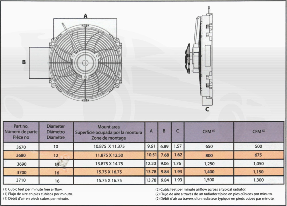 Dieser 16" (40,6cm) große Kühlerventilator von Hayden ist der leistungsstärkste Elektrolüfter aus unserem Onlineshop. Mit seinen geschwungenen Flügel erreicht dieser Kühlerlüfter einen maximalen Luftdurchsatz von 1500CFM wodurch er für Fahrzeuge mit großem Wasserkühler und leistungsstarkem V8-Motor bestens geeignet ist. Durch seine geringe Tiefer von nur 4.5" (114mm) trotzt 16" Durchmesser lässt sich dieser Lüfter auch in Fahrzeugen mit beengten Platzverhältnissen noch montieren. Zur Ansteuerung verwenden Sie entweder einen separaten Schalter (nicht im Lieferumfang) oder eine elektronische Lüftersteuerung wie die Hayden 3647 aus unserem Onlineshop. Die Montage erfolgt mittels der mitgelieferten Stifte durch den Kühler, oder durch Verschraubung der vorhandenen Haltenasen an einem existierenden Halter.