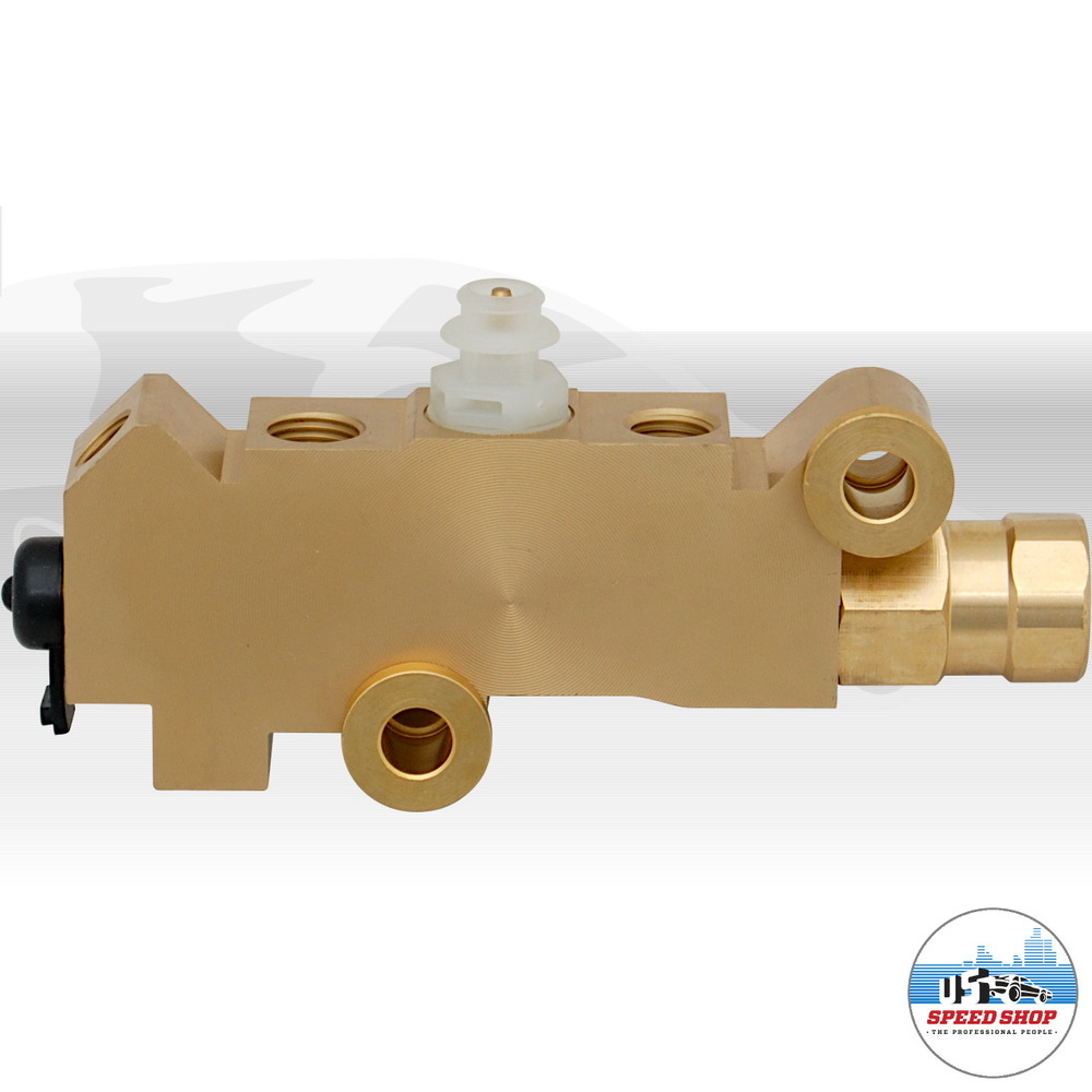 Dieses "Brake Proportioning Valve" von Classic Performance ist für Fahrzeuge mit Bremsscheiben an der Vorderachse und Trommelbremsen an der Hinterachse. Mit seinem Ausgleichsventil verhindert dieser Bremsdruckregler das Überbremsen an der Hinterachse, egal ob als Originalersatz oder für umgerüstete Fahrzeuge. Eingangsseitig verfügt es über einen 1/2-20" Anschluss für den vorderen, sowie einen 7/16-24" Anschluss für den hinteren Bremskreis. Der Anschluss an den vorderen Bremskreis erfolgt über zwei 3/8-24" Anschlüsse, der hintere Bremskreis wird über einen 9/16-18" Anschluss verbunden. Der integrierte Schalter kann z.B. mit einer Warnleuchte im Innenraum verbunden werden.